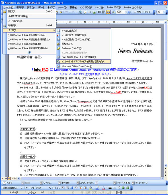株式会社ドゥイットは、2004年9月8日より、メールでFAX送受信ができるInterFAX(インターファックス)サービスに、Microsoft Office 2003アプリケーション連携機能の提供を開始いたします。