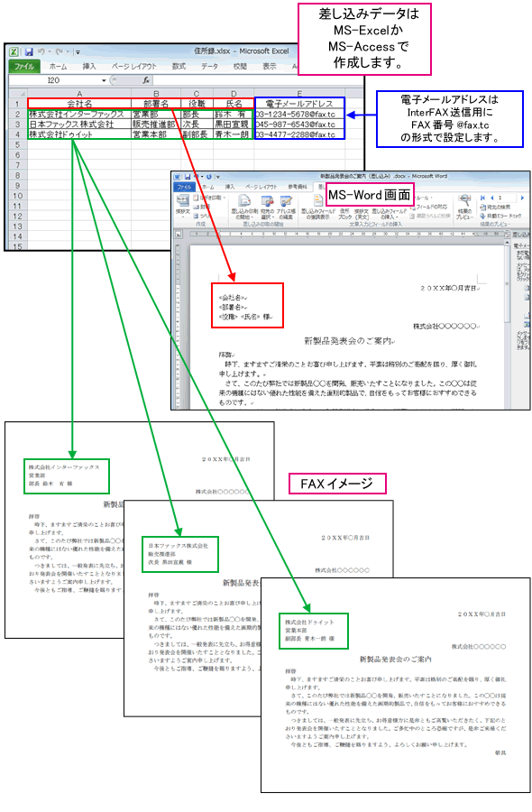 InterFAX送信サービスでは、MS-Wordの「差し込み印刷」機能(※)を使って、複数の相手先に違った内容(それぞれの宛名を入れる等)のFAXを送信することができます。