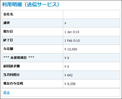 お客様の与信限度額および現在の与信残等は、アカウント管理Webにログインいただき、[アカウント管理]->[利用明細(送信サービス)]->[現在の状況]にてご確認いただけます。