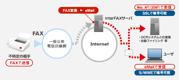 InterFAX受信サービスは、お申し込みをいただきますと、弊社よりFAX番号を1個割り当て、お客様へご提供いたします。提供いたしました番号へFAX機等からFAX送信をいたしますと、受信したFAXをPDFファイルまたはTIFFファイルのイメージデータとして、お申込時に登録したお客様のメールアドレスへ自動転送いたします。