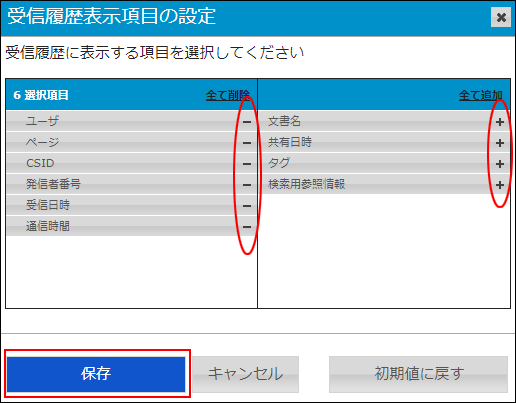 クリックすると「受信履歴表示項目の設定」画面が開き、受信履歴に表示する項目を選択することができます。