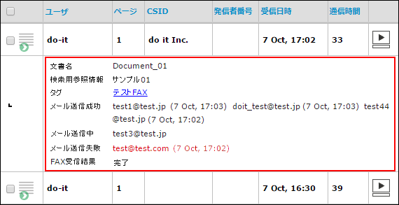 尚、FAXの受信結果は、各FAX受信履歴の詳細情報「FAX受信結果」からもご確認いただけます。詳細は本ページの「5.詳細情報の表示」をご参照ください。
