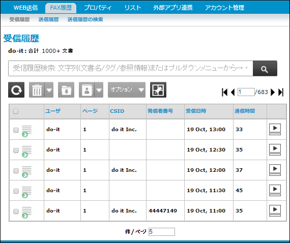 尚、ページあたりの表示件数は、ページ上部の[受信履歴]タグをクリックすると初期値(15件)に戻ります。