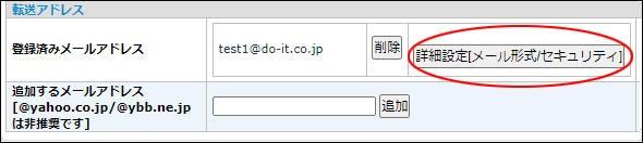 「プロパティ」画面で「詳細設定〔メール形式/セキュリティ設定〕」をクリックします。
