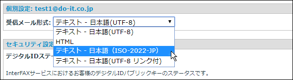 受信FAX転送メールのエンコードを「ISO-2022-JP」に変更するには、「個別設定」の「受信メール形式」から「テキスト - 日本語(ISO-2022-JP)」を選択します。