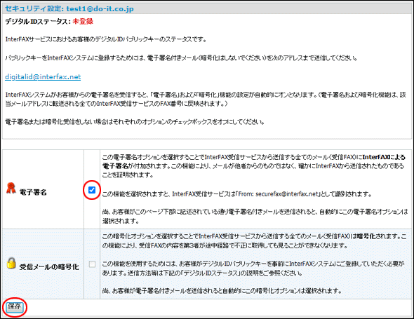 電子署名」右にある□をクリックして、チェックマークを付けます。その後、[保存]ボタンをクリックして設定を保存します。以降、InterFAXから届くメールには、InterFAXの電子署名が付加されます。