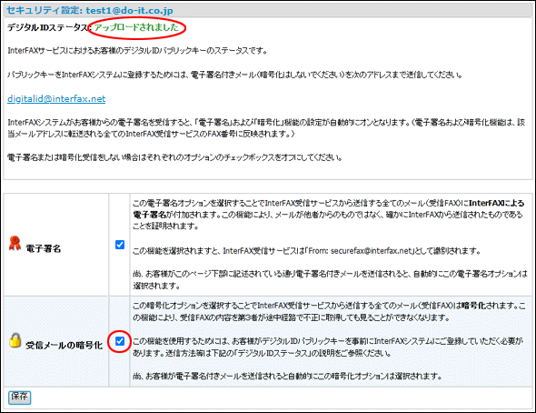受信FAX転送メールを暗号化するために、該当のメールアドレスからdigitalid@interfax.netへ電子署名付メールを送信された場合、同じメールアドレスを送信サービス利用可能者のアドレス(FromまたはReply-to)として、または「通知メールデフォルト送信先」として登録されているときには、受信FAX転送メールだけでなく、送信サービスの該当メールアドレスに届く通知メールも暗号化の設定が自動的におこなわれます。