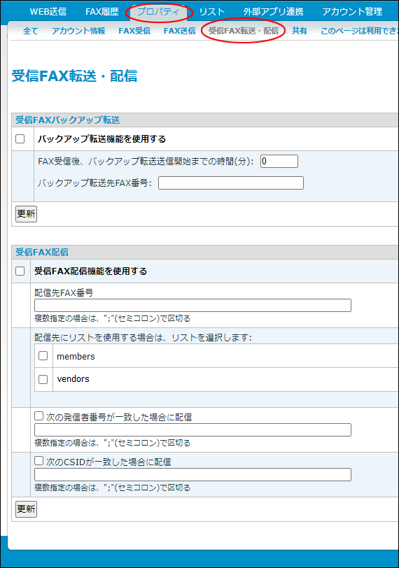 受信したFAXを指定した1つ以上のFAX番号またはリストの登録されたFAX番号へ配信することができます。リストに関しましては、[リスト]タブから管理が可能です。