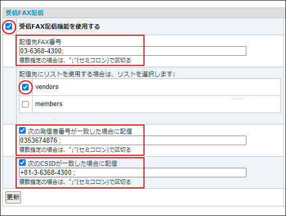 この機能を使用するには、それぞれの□にチェックを入れ、配信先FAX番号をボックスに入力します。