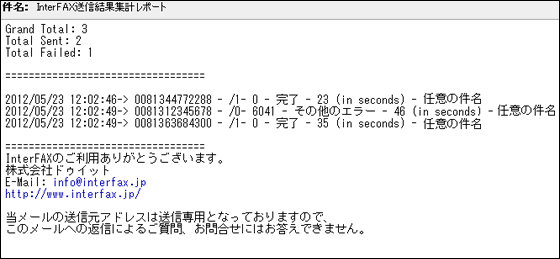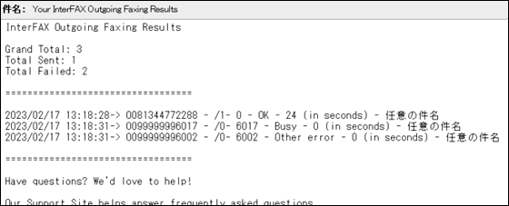 InterFAX送信サービスでは、FAX送信をおこなった結果を「通知メール」で確認することができます。