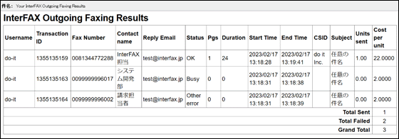 | Start Time | トランザクションの開始日時。InterFAX側でのメール受信日時です。 |
