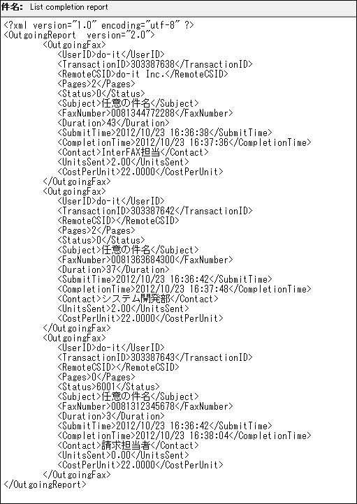 | TransactionID | トランザクション毎にInterFAXが割り当てる番号です。 問題が発生した場合のお問い合わせ時にこの番号をお教えください。 |