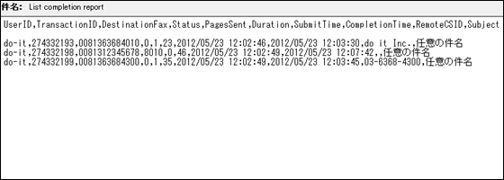 (ユーザID,メッセージID,送信先,送信結果,ページ数,通信時間,開始,終了,CSID,件名)