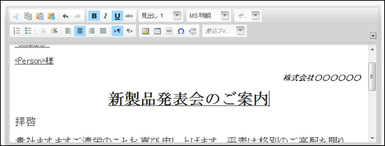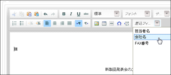 この機能を利用しますと、リストに登録されている送信先の「会社名」、「担当者名」、「FAX番号」をFAX内容に差し込んで送信することができます。