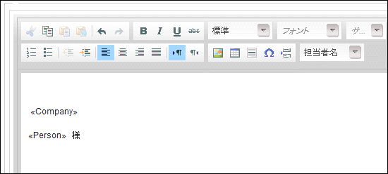 差し込み結果は以下のように表示されます。「会社名」は「<<Company>>」、「担当者名」は「<<Person>>」、「FAX番号」は「<<Fax>>」のように表示されます。