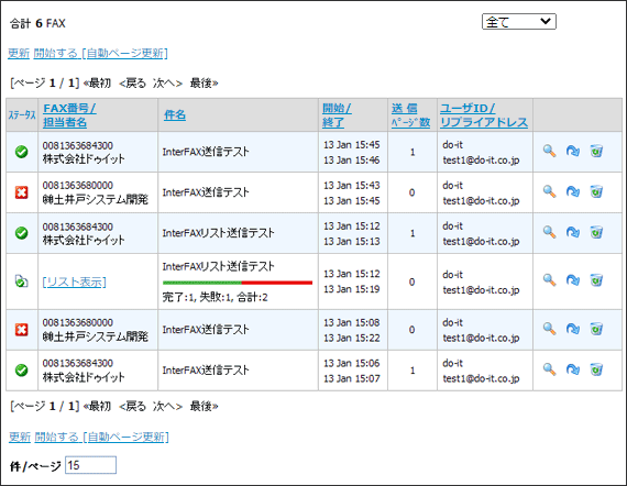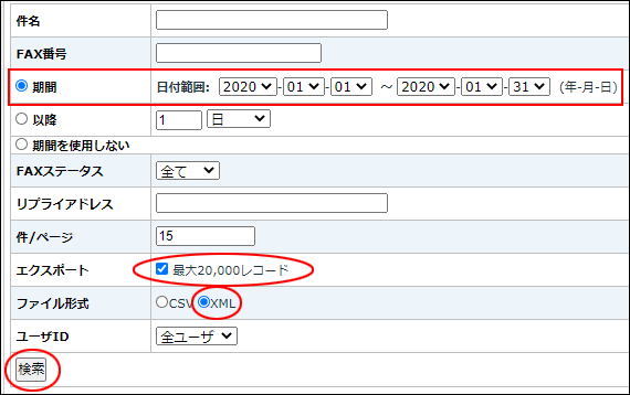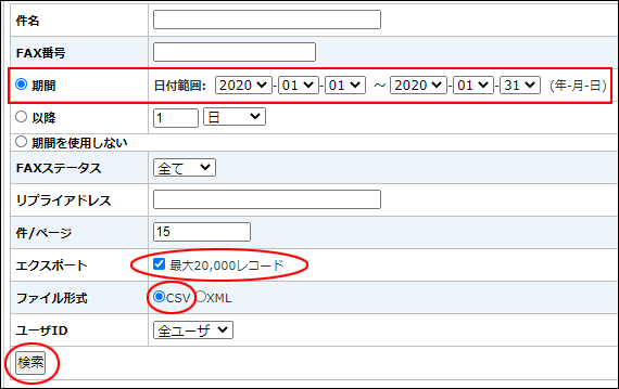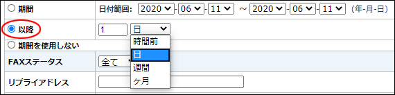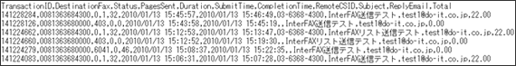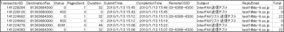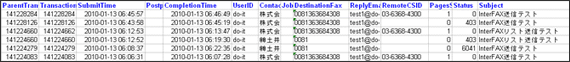 上記画面より、件名(Subject)、送信先FAX番号、送信日、FAXステータス、リプライアドレスに条件を設定することで、条件に一致した履歴データのみを抽出できます。