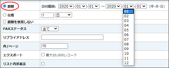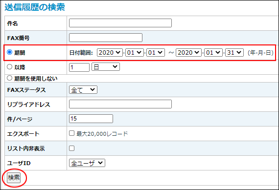 【例】 2020年1月1日から1月31日の間に送信した履歴を抽出する場合。