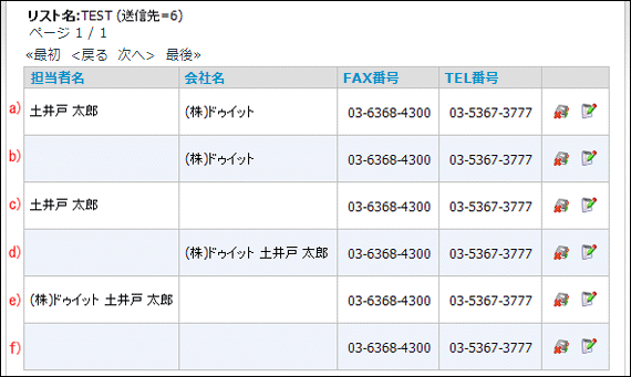 f)の場合、「担当者名」と「会社名」の両方が空白ですので、「FAX番号」が印字されます。