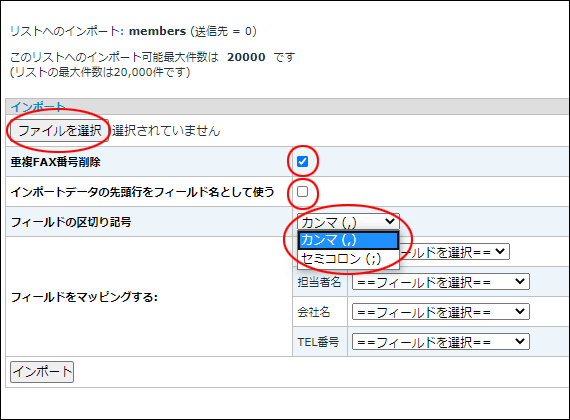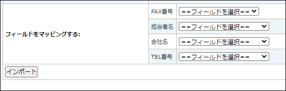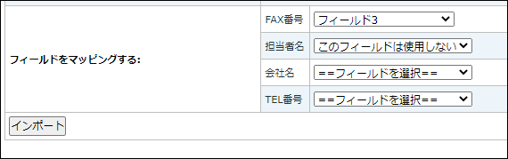 「フィールドをマッピングする」から各フィールド(FAX番号、担当者名、会社名、TEL番号)でファイル内容のフィールド順を選択します。用意したCSVファイルフィールド順が上記の通りの場合は次の通り、フィールドを選択します。