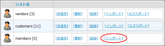 インポートが正常に終了しましたら、戻るまたは「リスト表示」をクリックしてリスト表示画面に戻り、該当リストの[送信先]をクリックして、データの内容を確認してください。